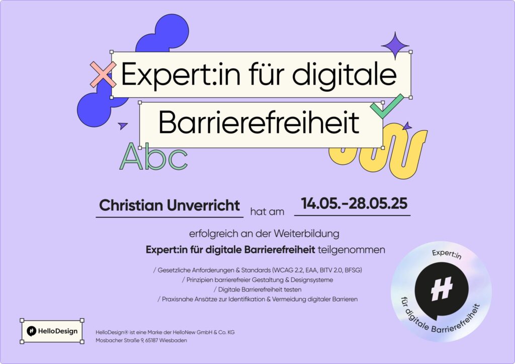 Bereits vor dem neuen Gesetz zur digitalen Barrierefreiheit habe ich mich intensiv mit dem Thema beschäftigt. Da sich durch das BFSG nun auch die Anfragen häufen, habe ich mich zum Experten für digitale Barrierefreiheit weitergebildet.